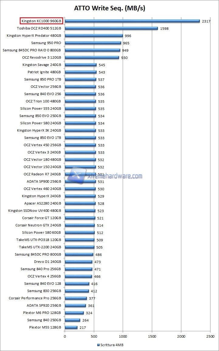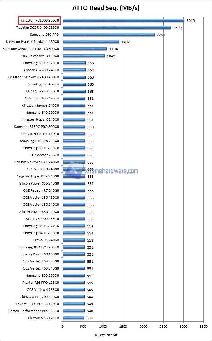 A seguire i grafici con i valori ottenuti dal Kingston KC1000 da 960GB: